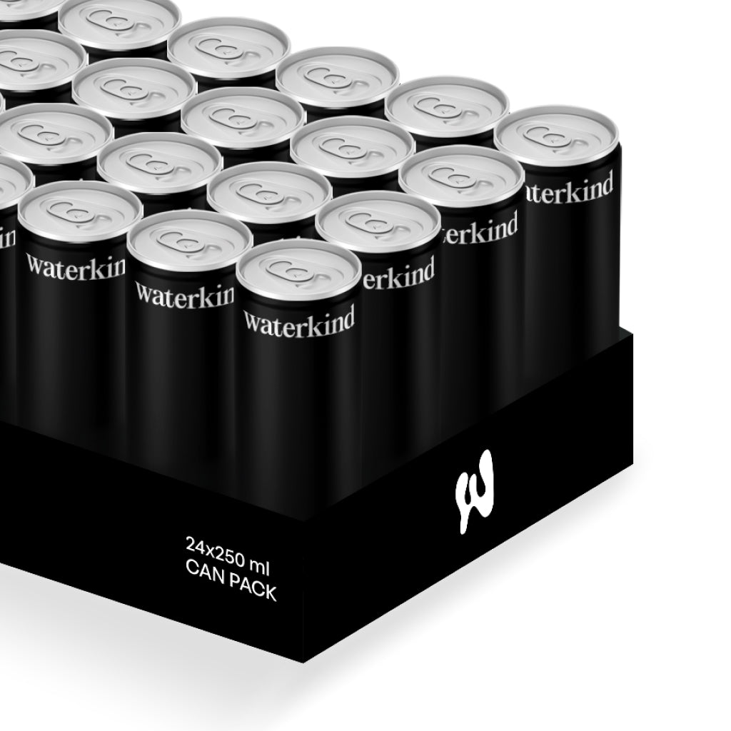 Pack of 24 × 250ml cans. Clean, simple hydration — on its own or mixed with your favorite Waterkind electrolytes.